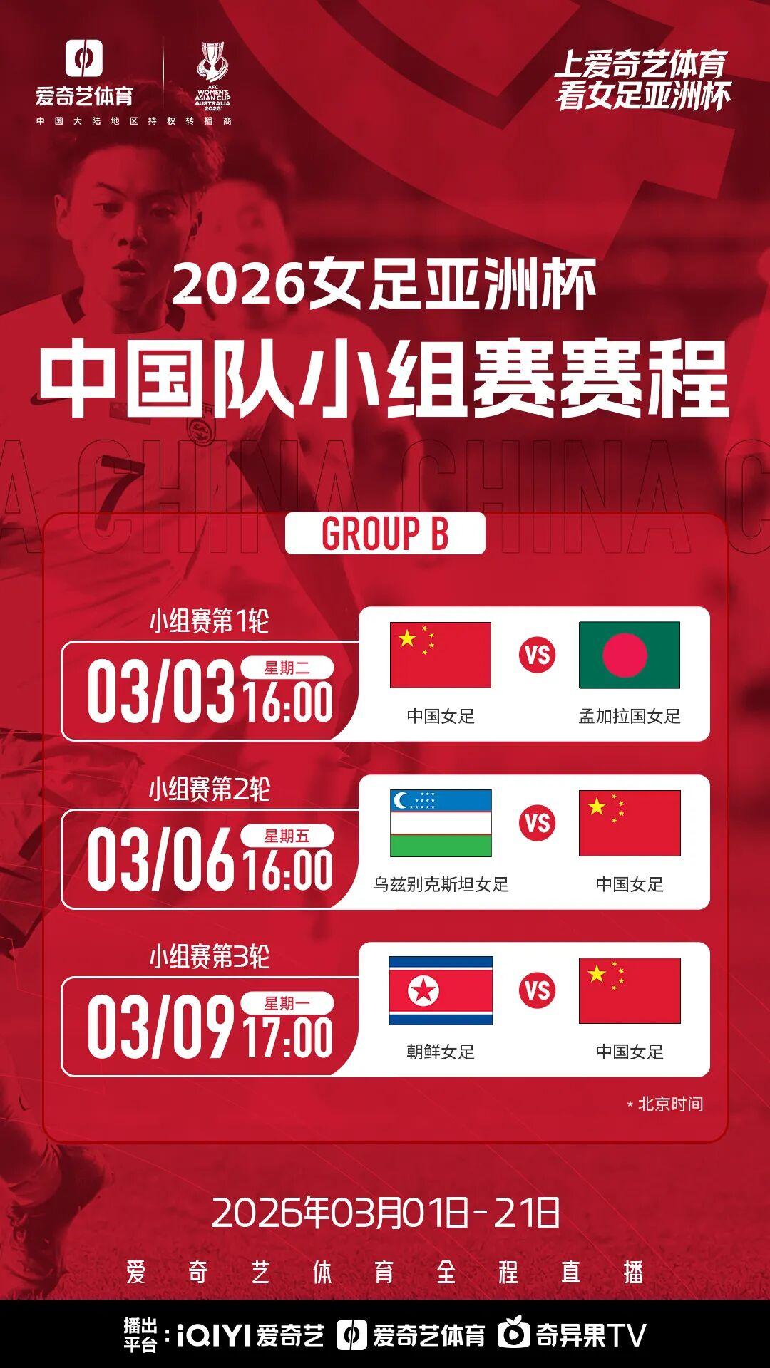 3月3日16:00 女足亚洲杯小组赛第1轮 中国女足 - 孟加拉国女足